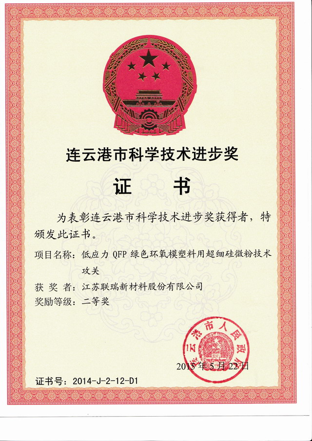 江蘇NOVORAY新质料株式会社は继续して実施した「低応力QFP緑エポキシ型プラスチック用極細シリコン粉末技術攻略プロジェクト」は、光栄に「連雲港市科学技術進歩の二等賞」を獲得しました。。。。。。